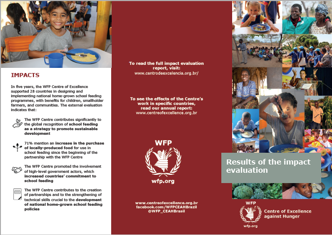 Este folder apresenta um resumo da análise qualitativa das atividades do Centro de Excelência contra a Fome do WFP entre os anos de 2011 e 2016, bem como avalia a eficiência das estratégias e quais objetivos foram alcançados pelo Centro nesses anos. Publicação feita em parceria com Centro de Estudos e Articulação da Cooperação Sul-Sul/Move Social. Disponível apenas em inglês.