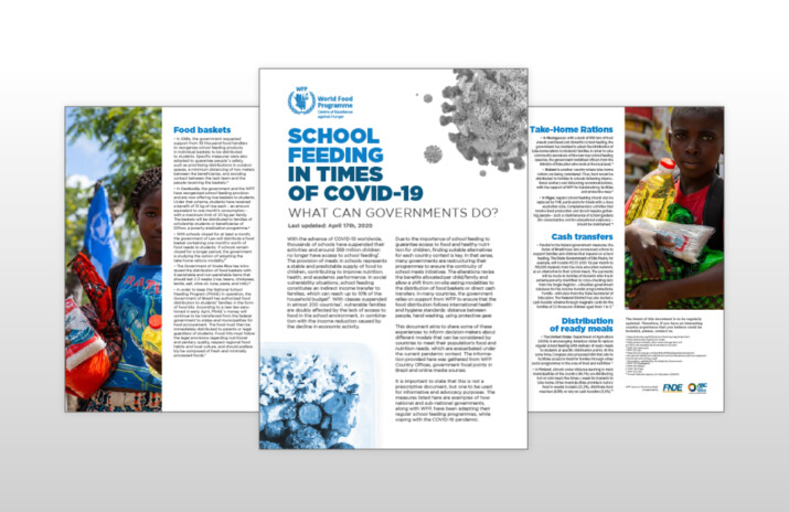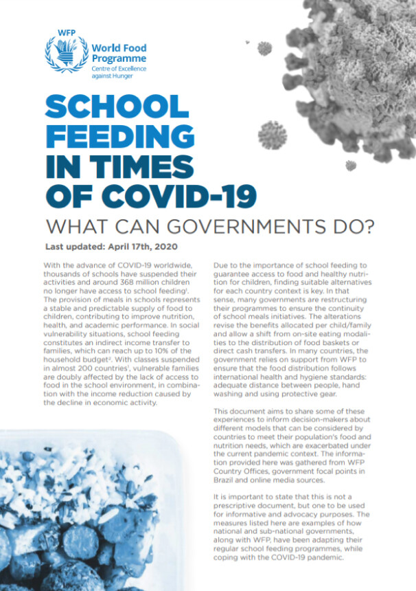 Com o avanço do COVID-19 em todo o mundo, milhares de escolas foram fechadas e cerca de 368 milhões de crianças deixaram de ter acesso à alimentação escolar. A distribuição de alimentos nas escolas representava uma oferta estável e previsível de alimentos para as crianças, contribuindo para melhor nutrição e saúde, e para o desempenho acadêmico. Para assegurar a continuidade das iniciativas de alimentação escolar, diversos governos estão reformulando seus programas. As alterações incluem desde a revisão dos benefícios alocados por criança/família até a revisão das modalidades de distribuição para oferta de cestas ou transferência direta de renda.